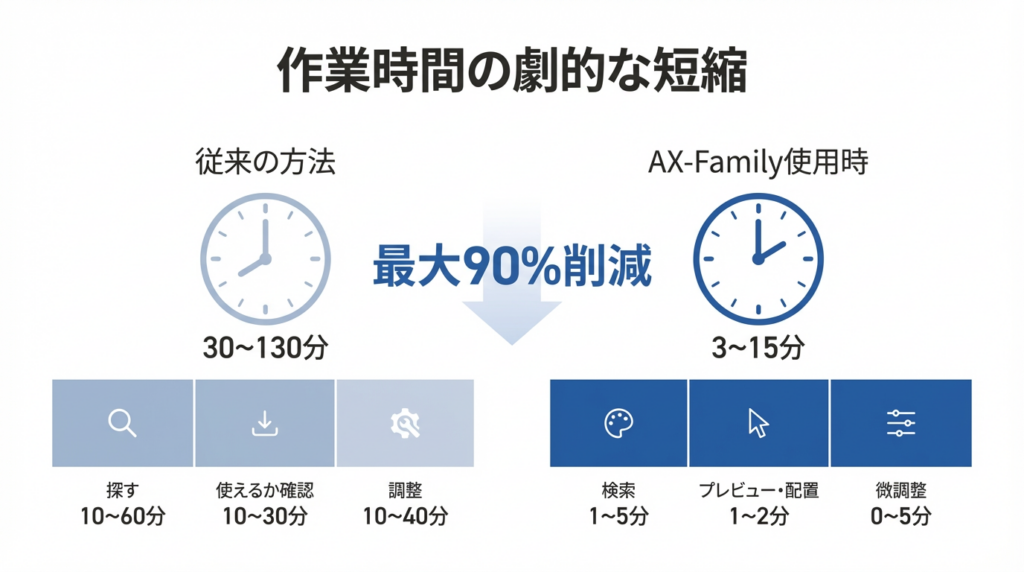 1,700点以上のAReXオリジナルファミリをラインアップし、シーンに合わせて最適なファミリを活用できます。