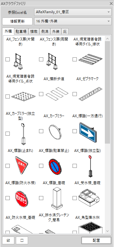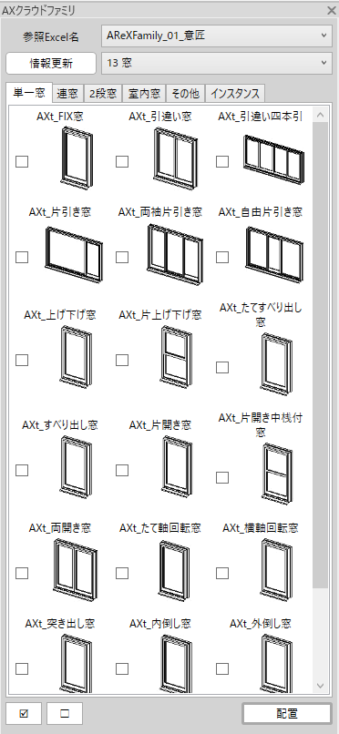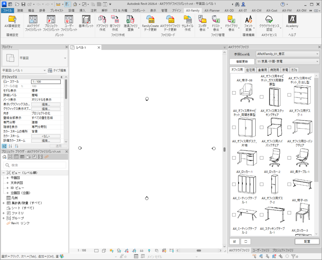クラウドに格納されたAReX-Style オリジナルのAXLibraryファミリを、一覧から選択してプロジェクトに配置することができます。