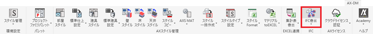 [AX-DM]タブ > [IFC]パネル > [IFC書出]コマンドを選択します。