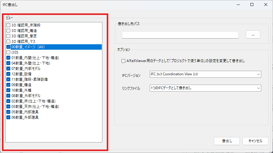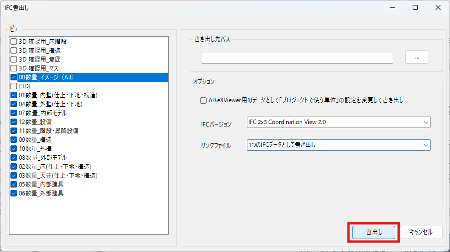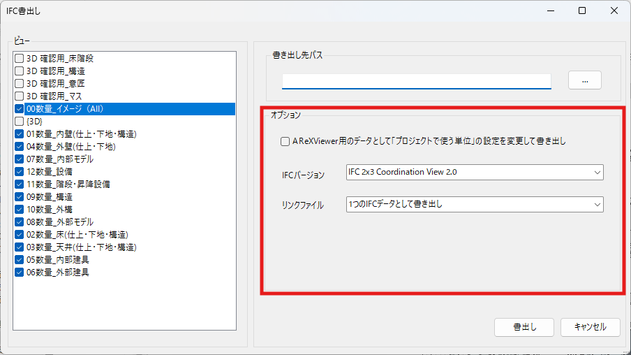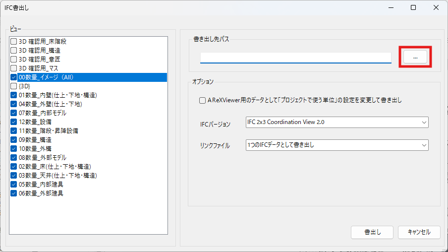 ダイアログ右側の[書き出し先パス]項目の[…]ボタンをクリックし、IFCデータの保存先を指定します。
