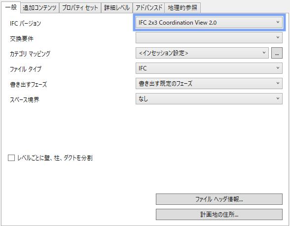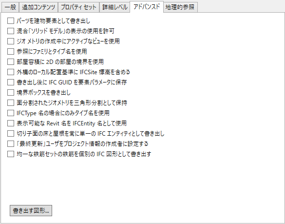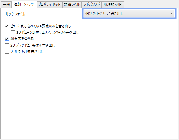 ダイアログ右側の[オプション]項目で、書き出すIFCデータのバージョンとリンクファイルについて設定します。