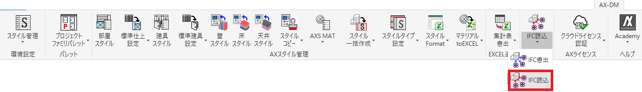 [AX-DM]タブ > [IFC]パネル > [IFC書出]コマンドの下部▼をクリックし、ドロップダウンメニューから[IFC読込]コマンドを選択します。