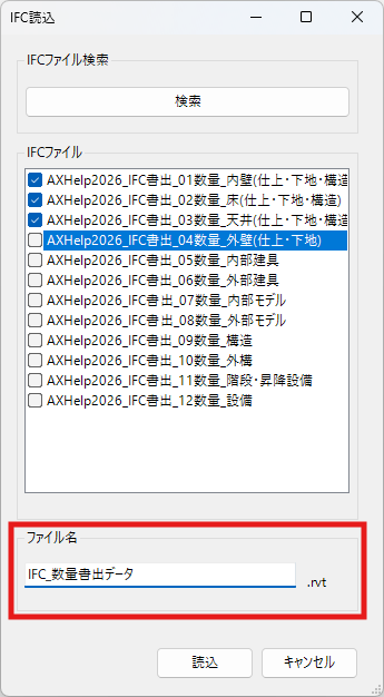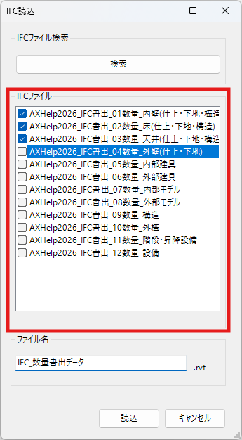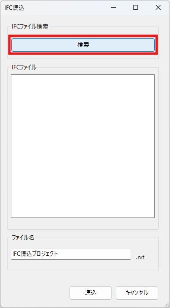 [ファイル名]項目で、IFCを読み込むプロジェクトファイルの名前を設定して、[読込]ボタンをクリックします。
