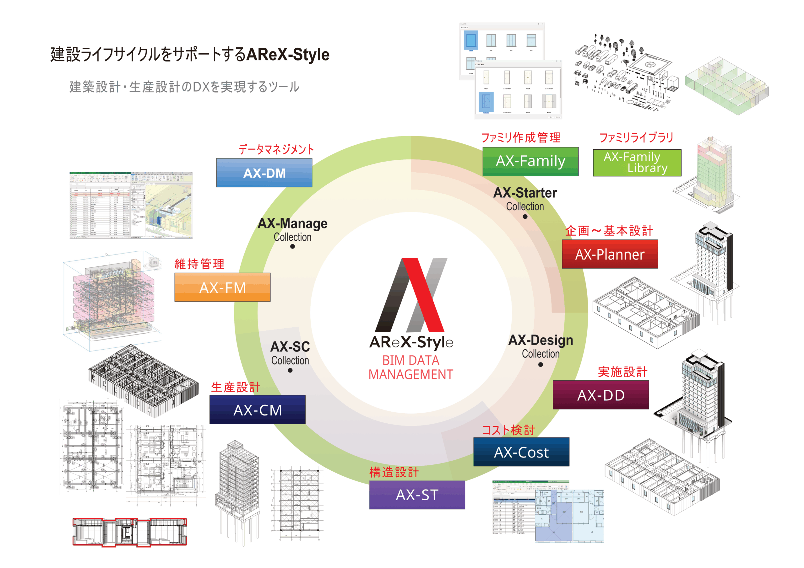 意匠設計、構造設計、生産設計、施工、コスト管理、維持管理、データマネジメント、ファミリ作成・管理、ファミリライブラリの利用、管理運用までに対応。